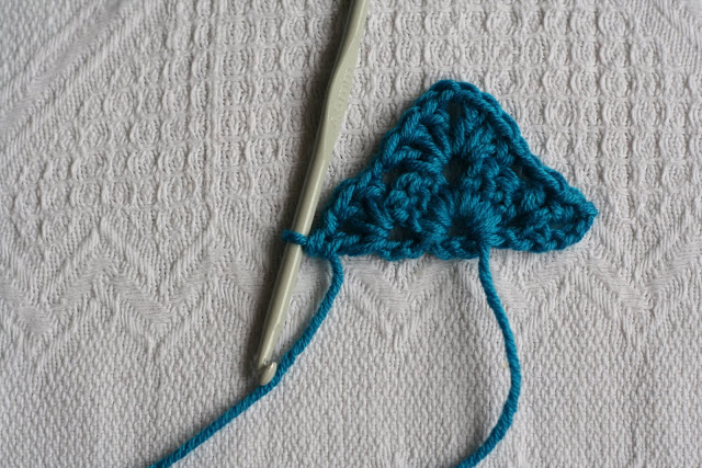 Dále háčkuju do kroužku: 3ŘO (nahradí 1dlouhý sloupek) - 1ŘO (mezera) - 3DS - 2ŘO (vrchol trojúhelníku) - 3DS - 1ŘO - 1DS. První trojúhelník je hotový. Řada z Vás tento motiv zná, kdybychom pokračovali dál, vznikl by tradiční Granny square, který je základním motivem dobře známých dek a polštářů. Šál je ale poloviční Granny sqaure, proto dále pokračovat nebudeme a vezmeme to zase zpátky:o)